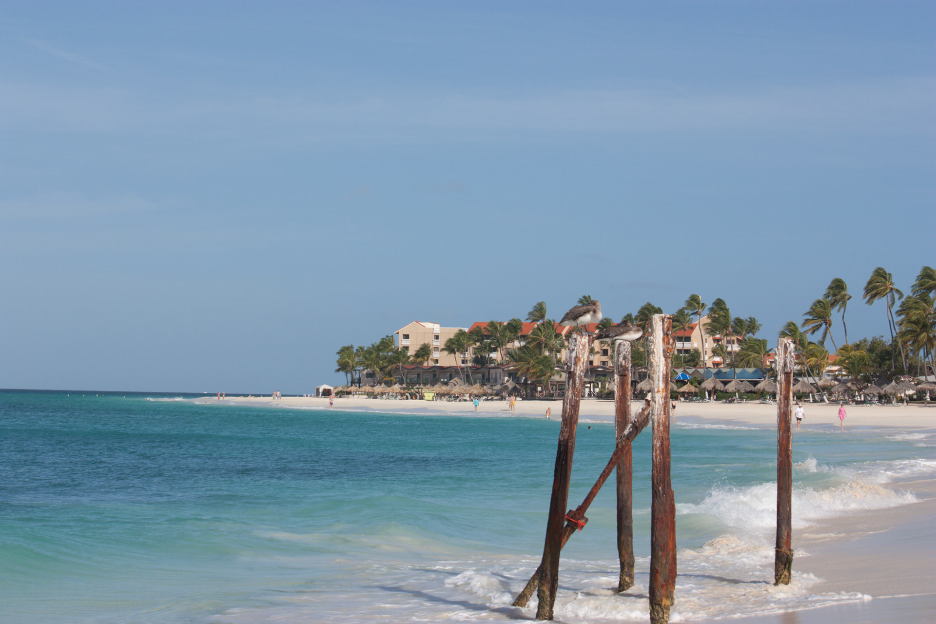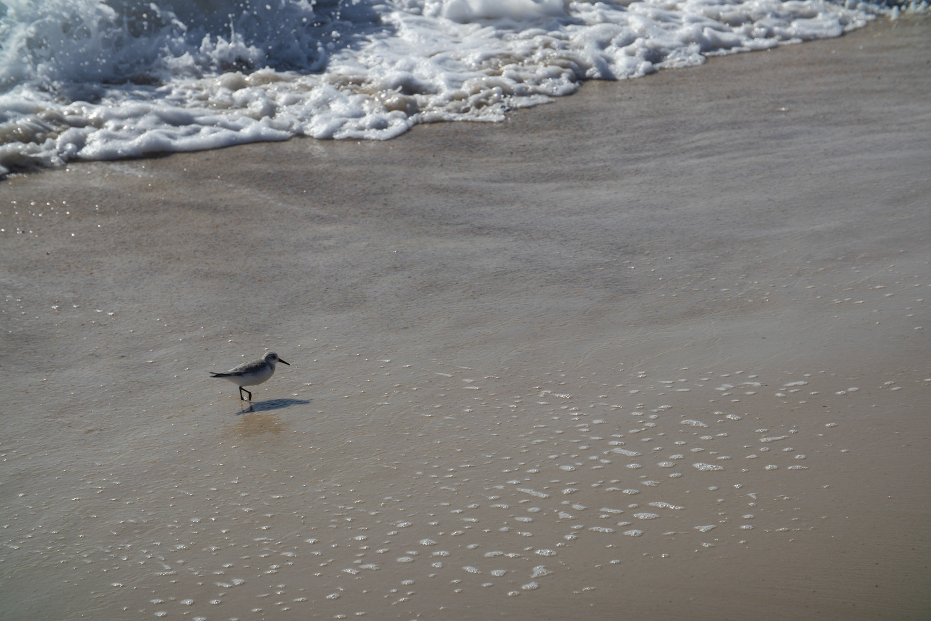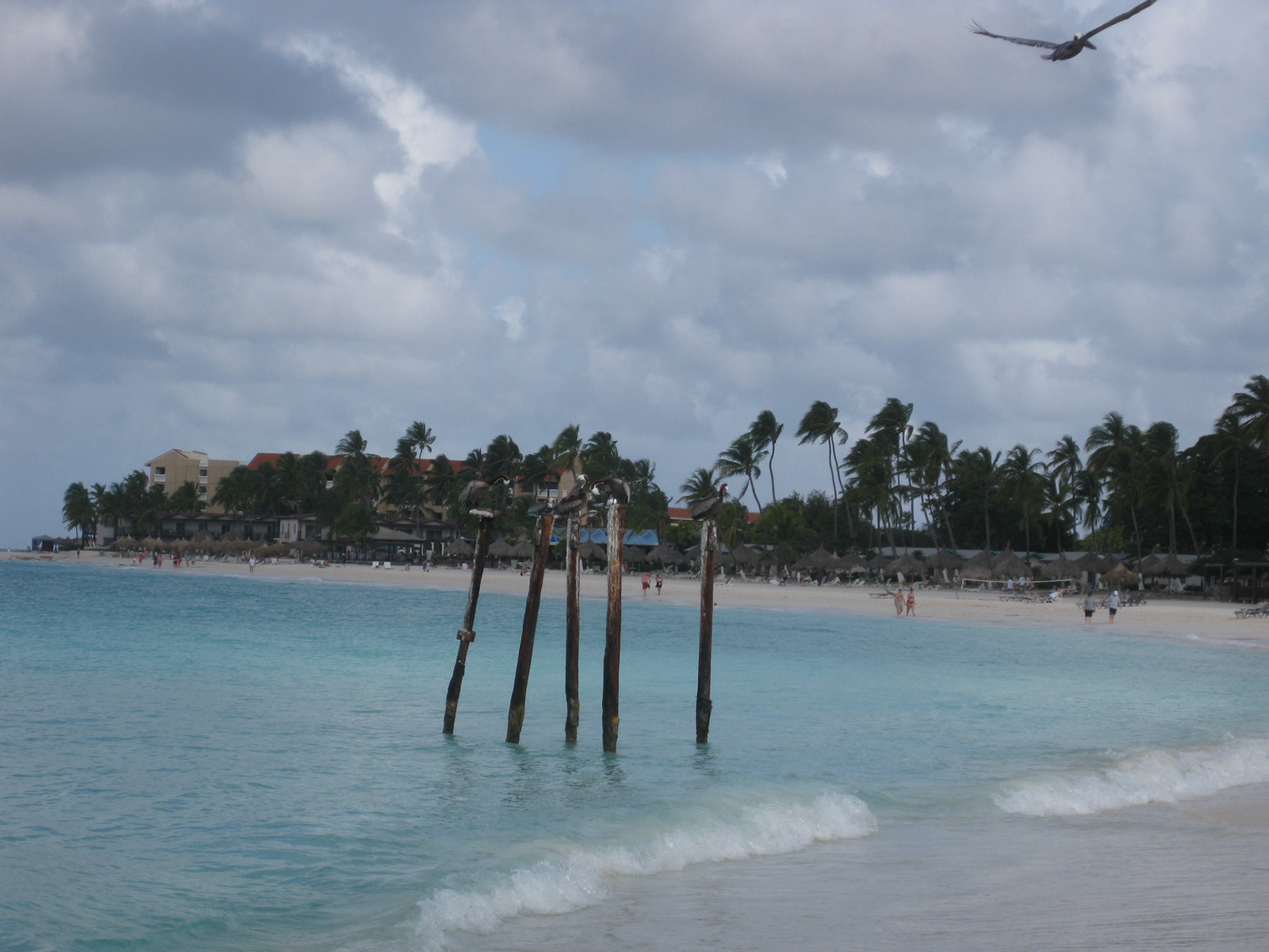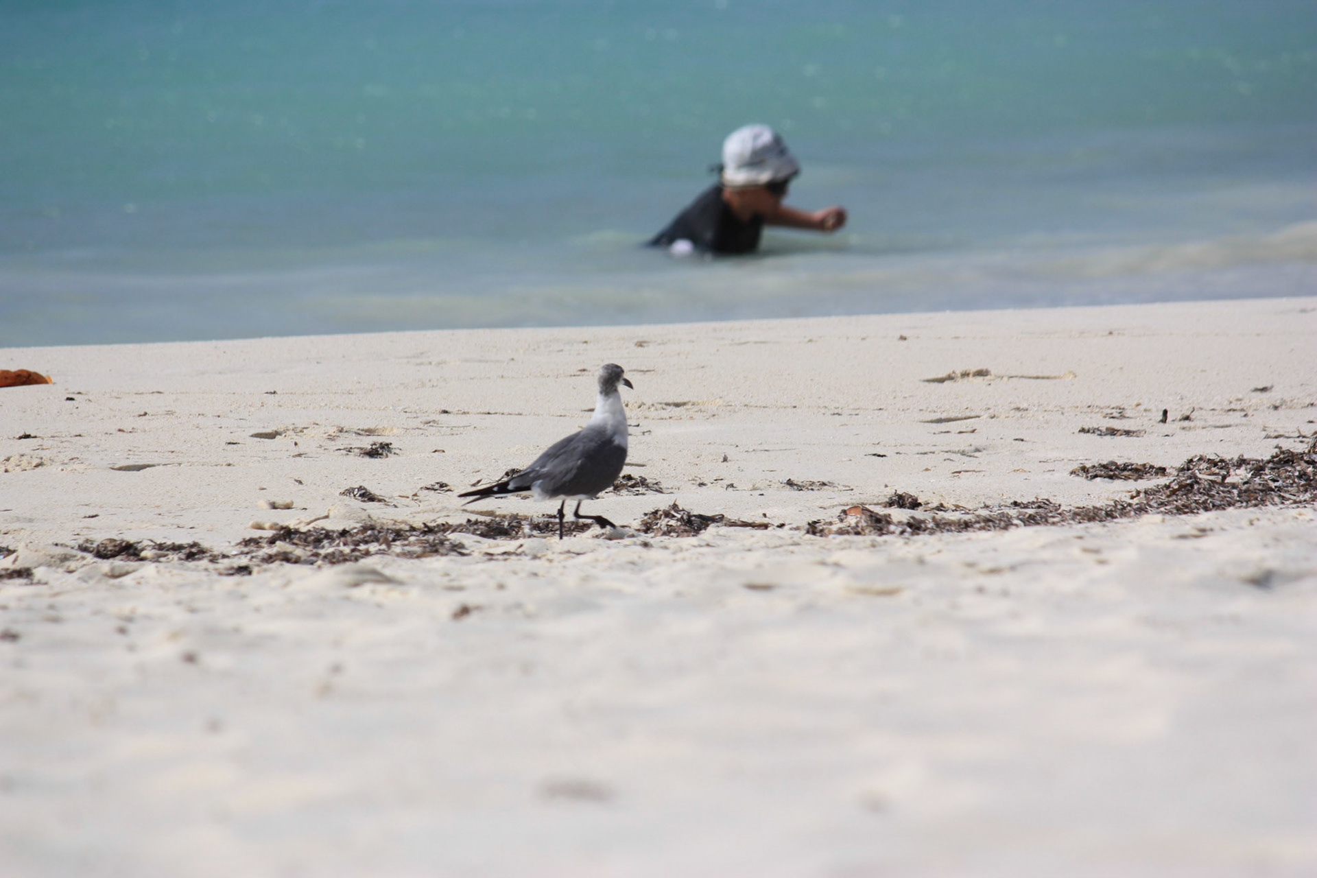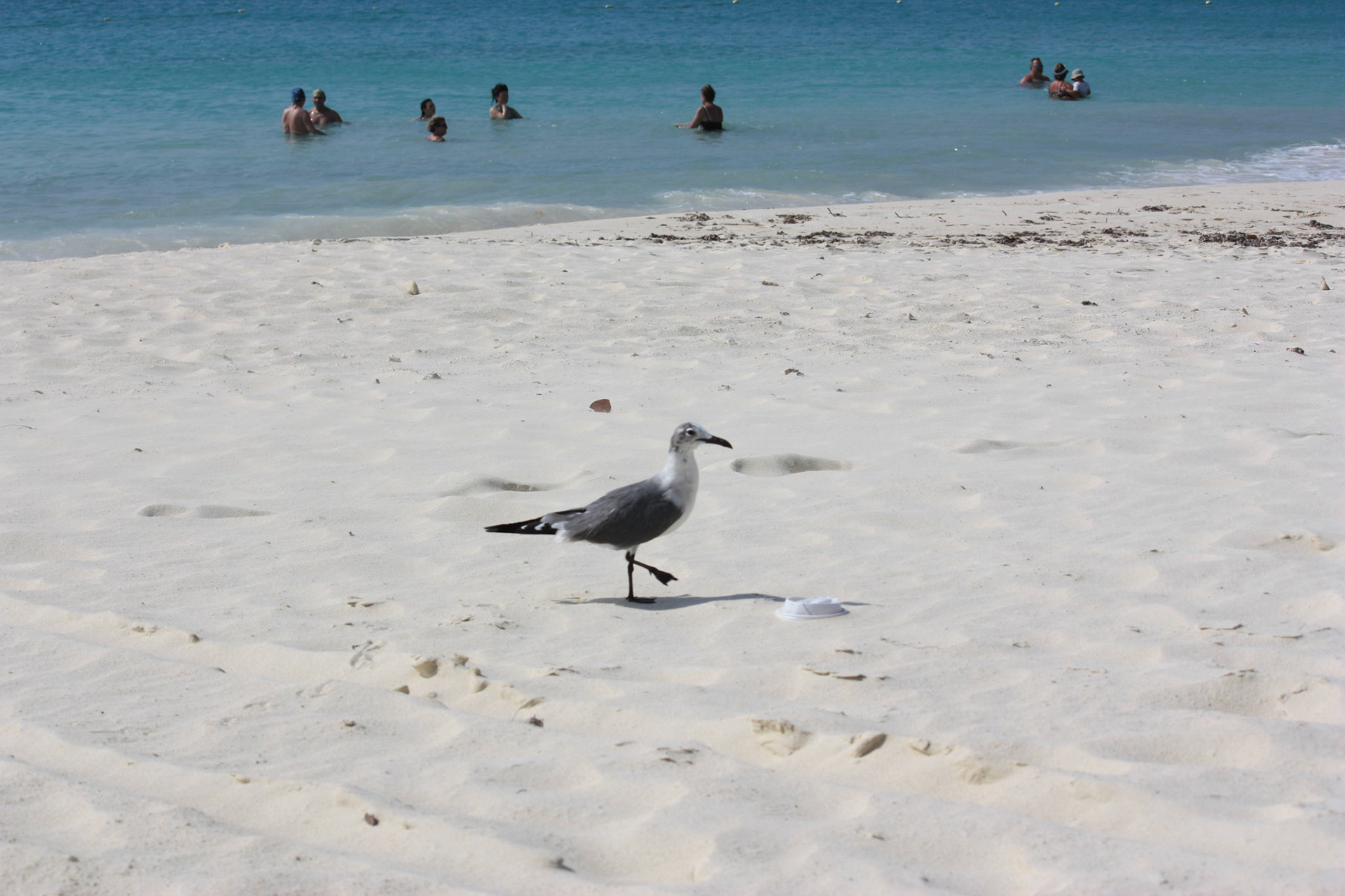 Seagull stolls along beach while people swim