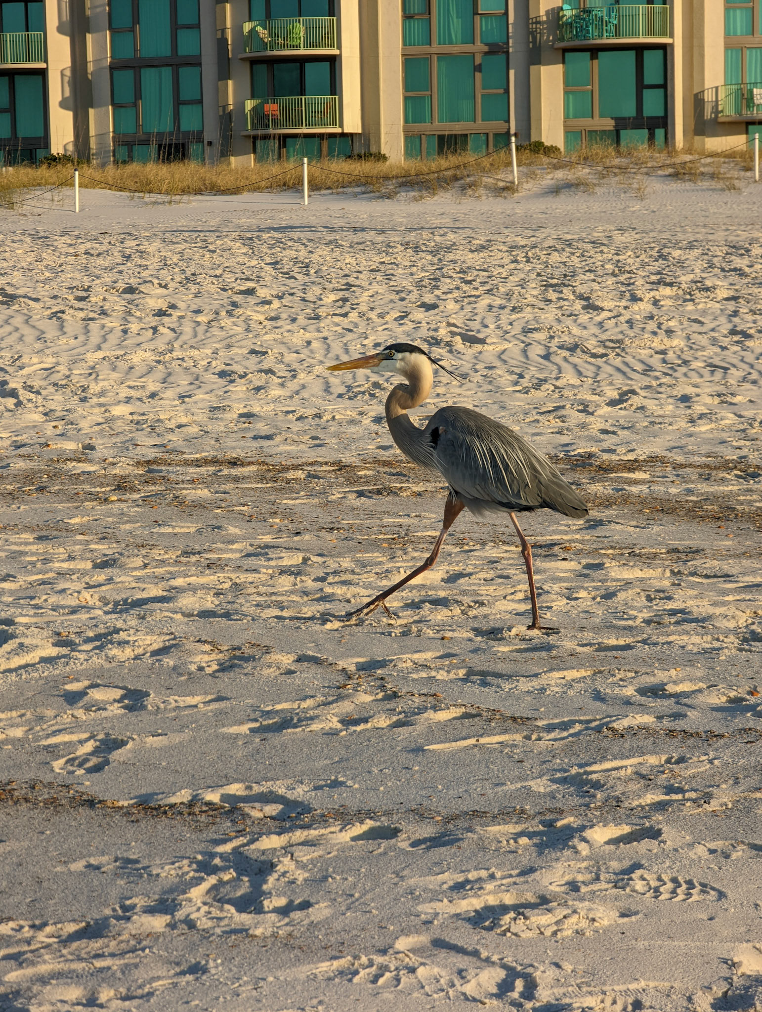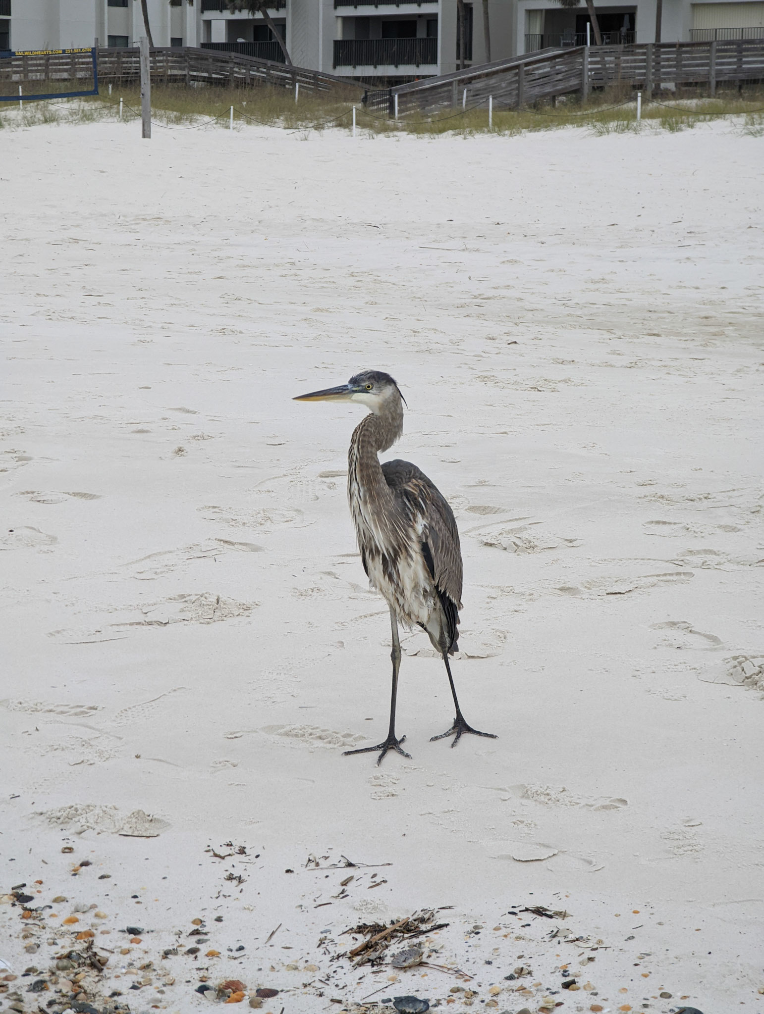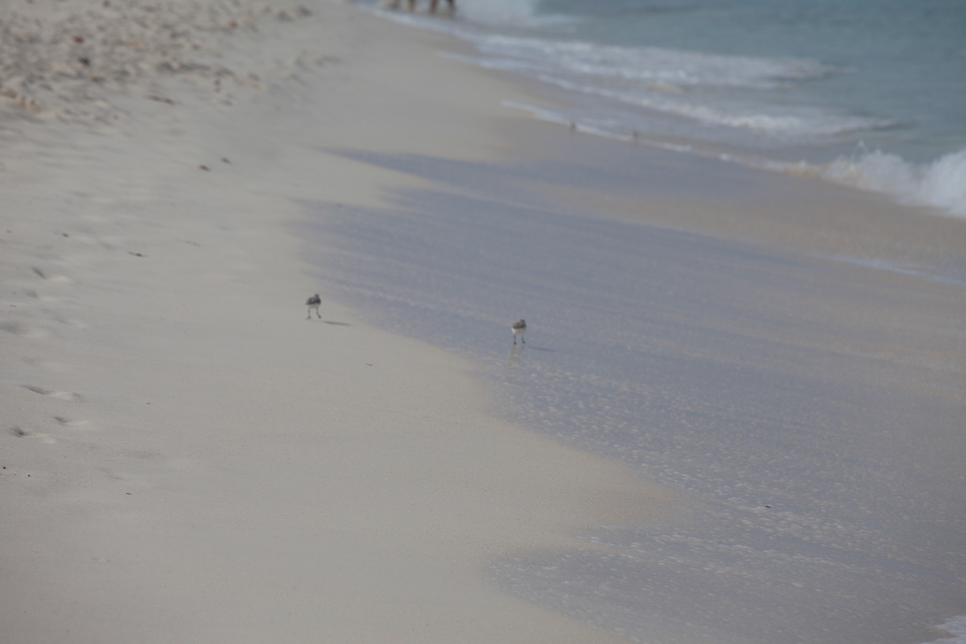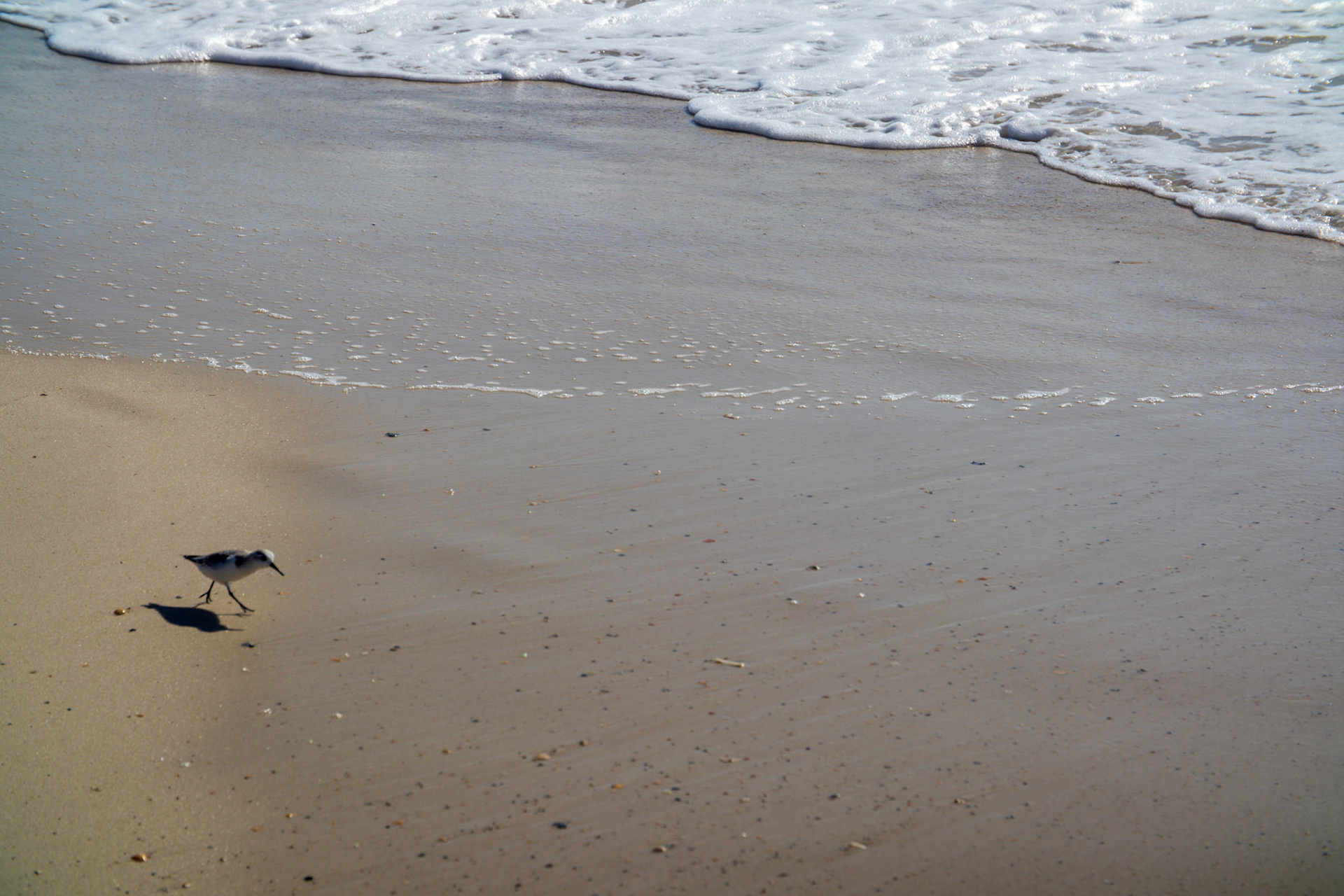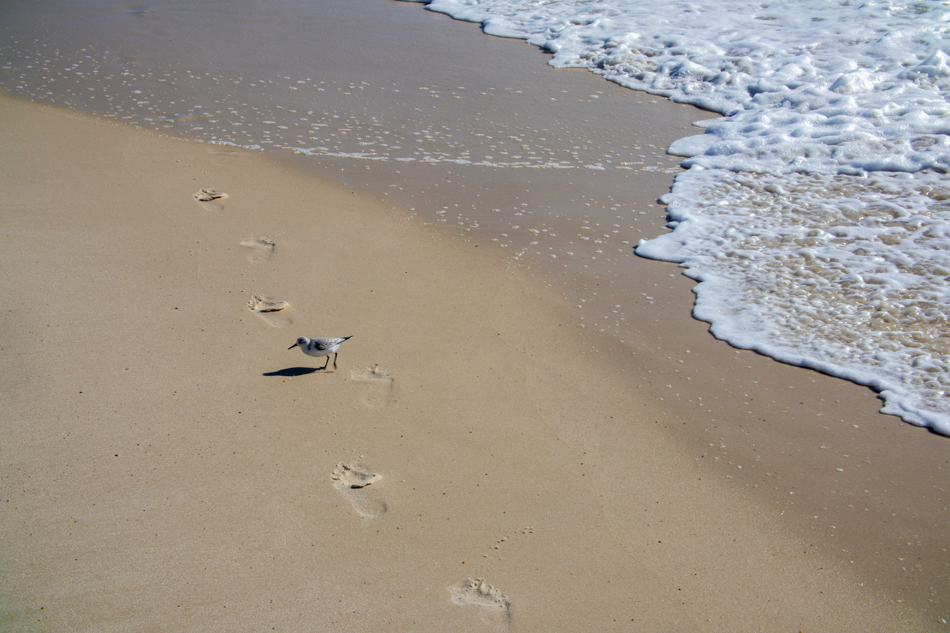 Seagull stolls along beach while people swim